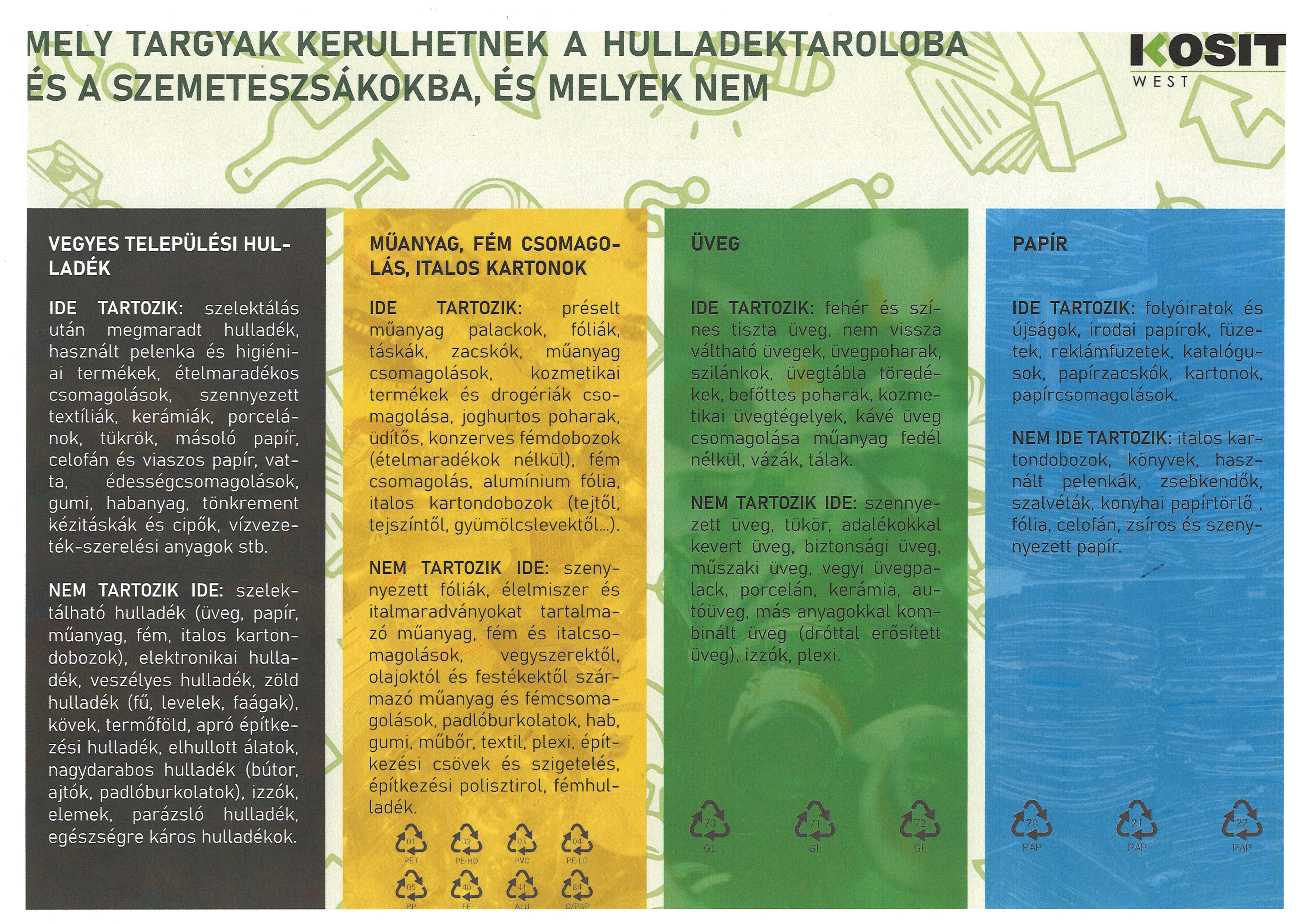 A FÉMEK és TÖBBRÉTEGŰ KOMBINÁLT ANYAGOK (tetracsomagok) és a MŰANYAG egy zacskóba összerakható, vagy tovább válogatható, de a műanyaggyűjtés napján reggel 7:00-kor a ház előtt jól látható helyen elhelyezhető.