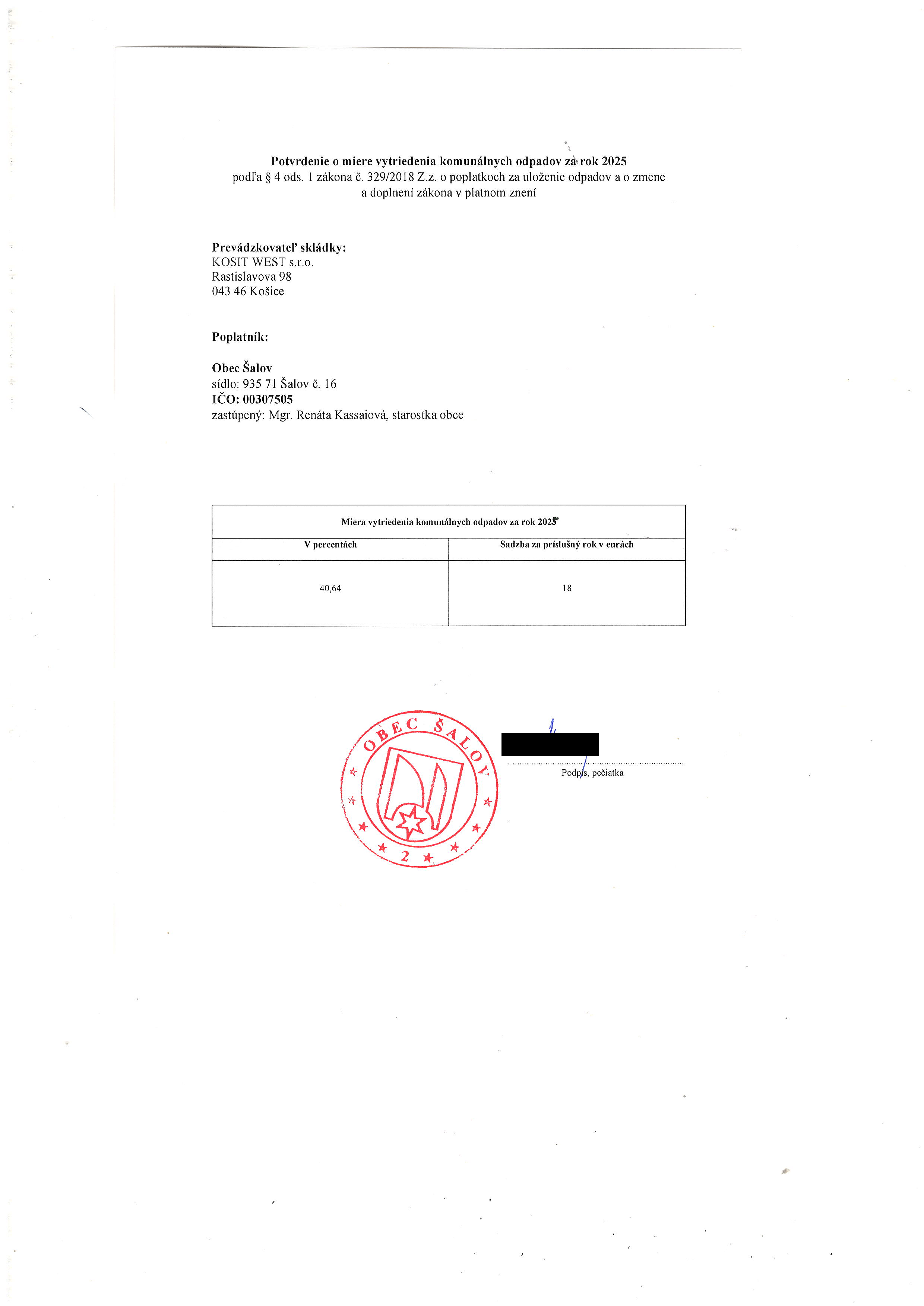 Potvrdenie o miere vytriedenia komunálnych odpadov za rok 2025 Stiahnuté: 27x | 18.02.2026