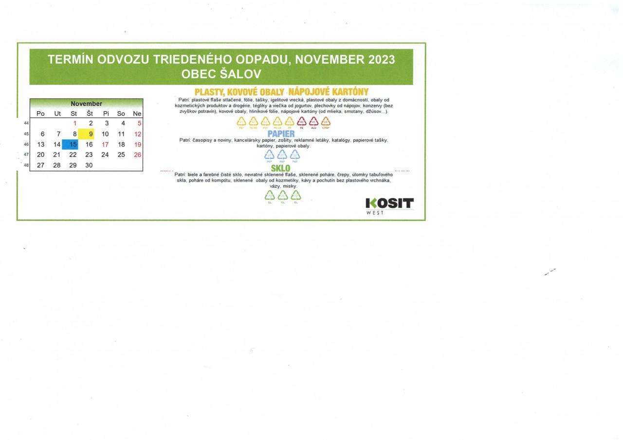 Termín odvozu triedeného odpadu november 2023 - Vállogatott hulladék elszállítása november 2023