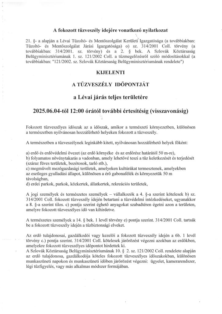 Vyhlásenie času zvýšeného nebezpečenstva vzniku požiaru / A fokozott tűzveszély idejére vonatkozó nyilatkozat