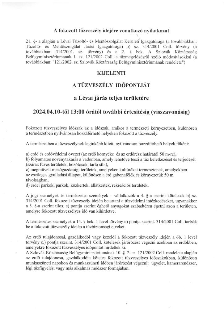 Vyhlásenie času zvýšeného nebezpečenstva vzniku požiaru/A fokozott tuzveszélyre vonatkozó nyilatkozat