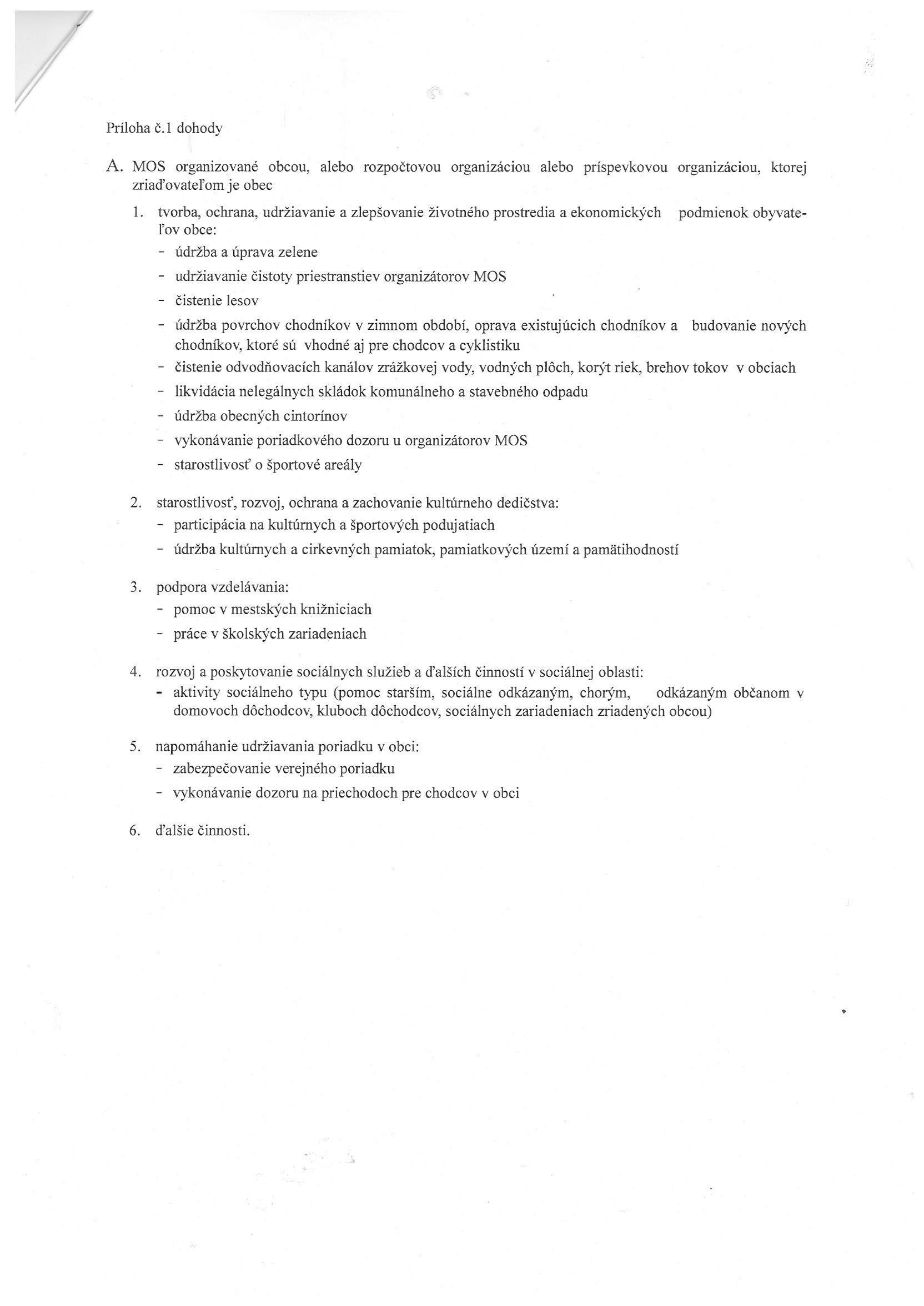 - Predmet zmluvyÚprava práv a povinností účastníkov dohody pri zabezpečení a výkone menších obecných služieb pre obec na účely aktivačného príspevku, ktorý je určený na podporu udržania pracovných návykov plnoletého uchádzača o zamestnanie, ktorý je členom domácnosti, ktorej sa poskytuje pomoc v hmotnej núdzi.